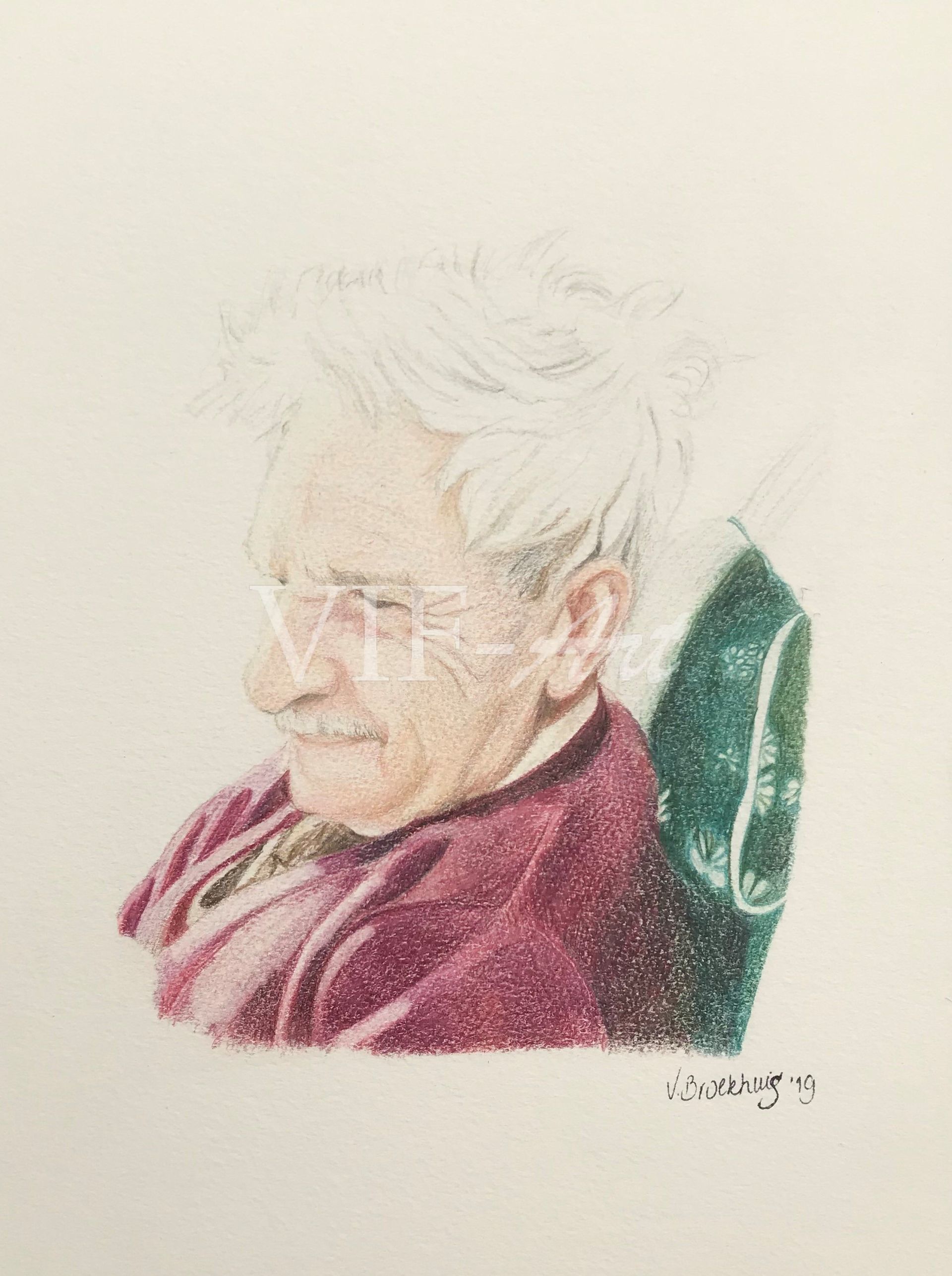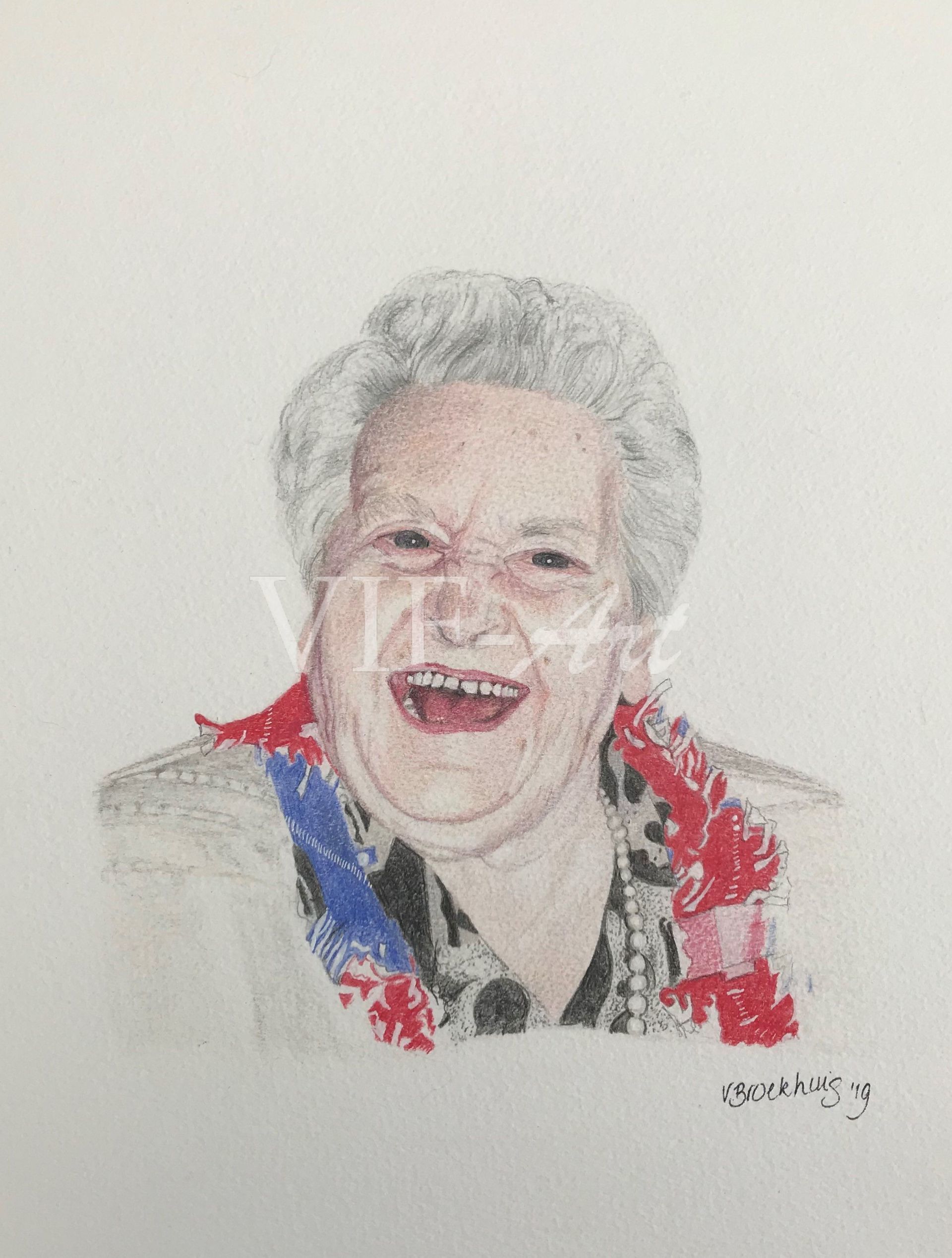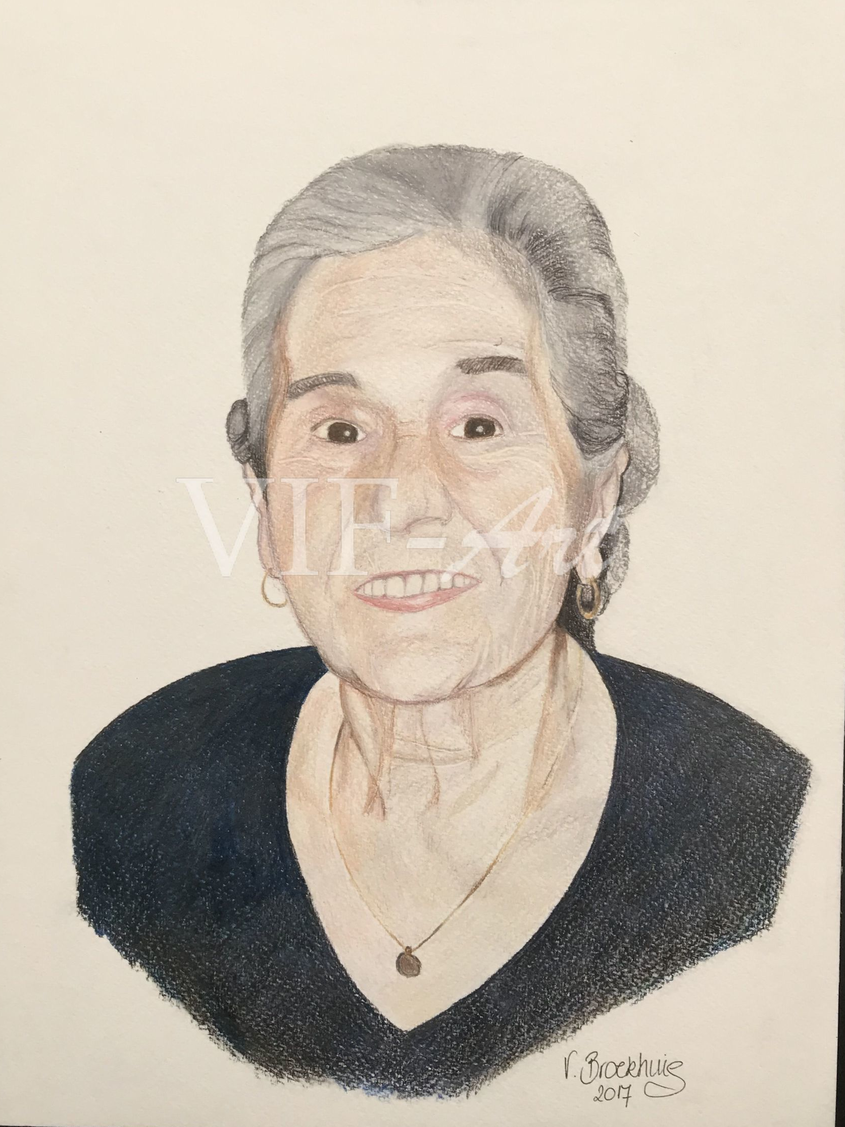 Ik vertelde haar dat ik dat nog nooit had gedaan, maar mijn vriendin had het volste vertrouwen in mijn tekentalent. Na veel twijfel en onzekerheid ben ik dan toch de uitdaging aangegaan. Vanwege een onscherpe foto met veel harde schaduwen en onduidelijkheid van haartooi etc., heb ik in overleg met mijn vriendin een aantal keuzes gemaakt. Een aantal weken later was het af en was ik bij de overhandiging. De emotie die loskwam bij haar vriendin toen ze het portret zag, was voor mij het teken dat ik haar moeder duidelijk getekend had. Nadat de emoties gezakt waren, deed deze vrouw me beloven dat ik niet ging stoppen met portret tekenen.