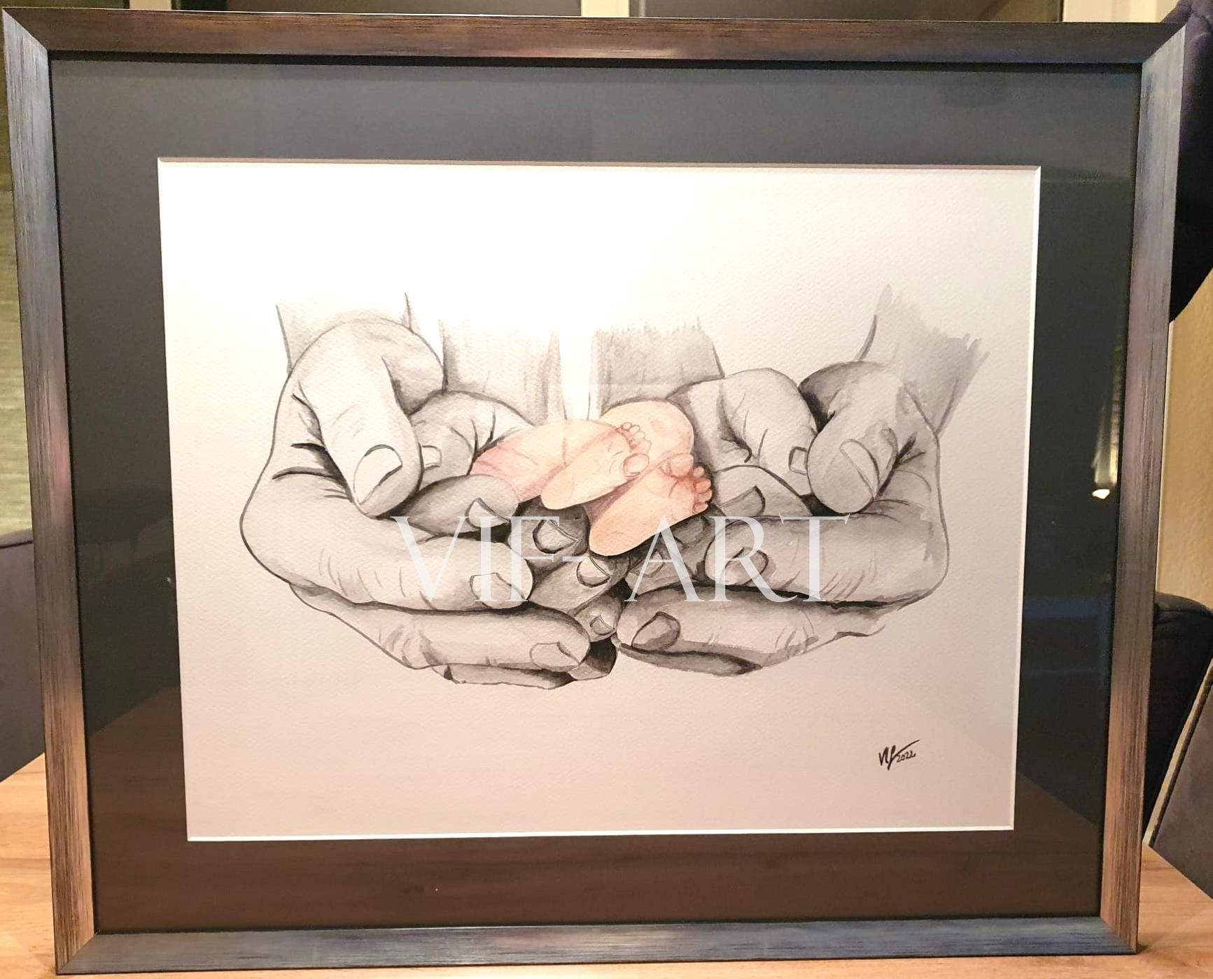 Ongeveer 3 weken geleden hebben wij aan Veerle gevraagd of zij een mooie aquarel wilde maken van Dylan zijn voetjes in onze handen.